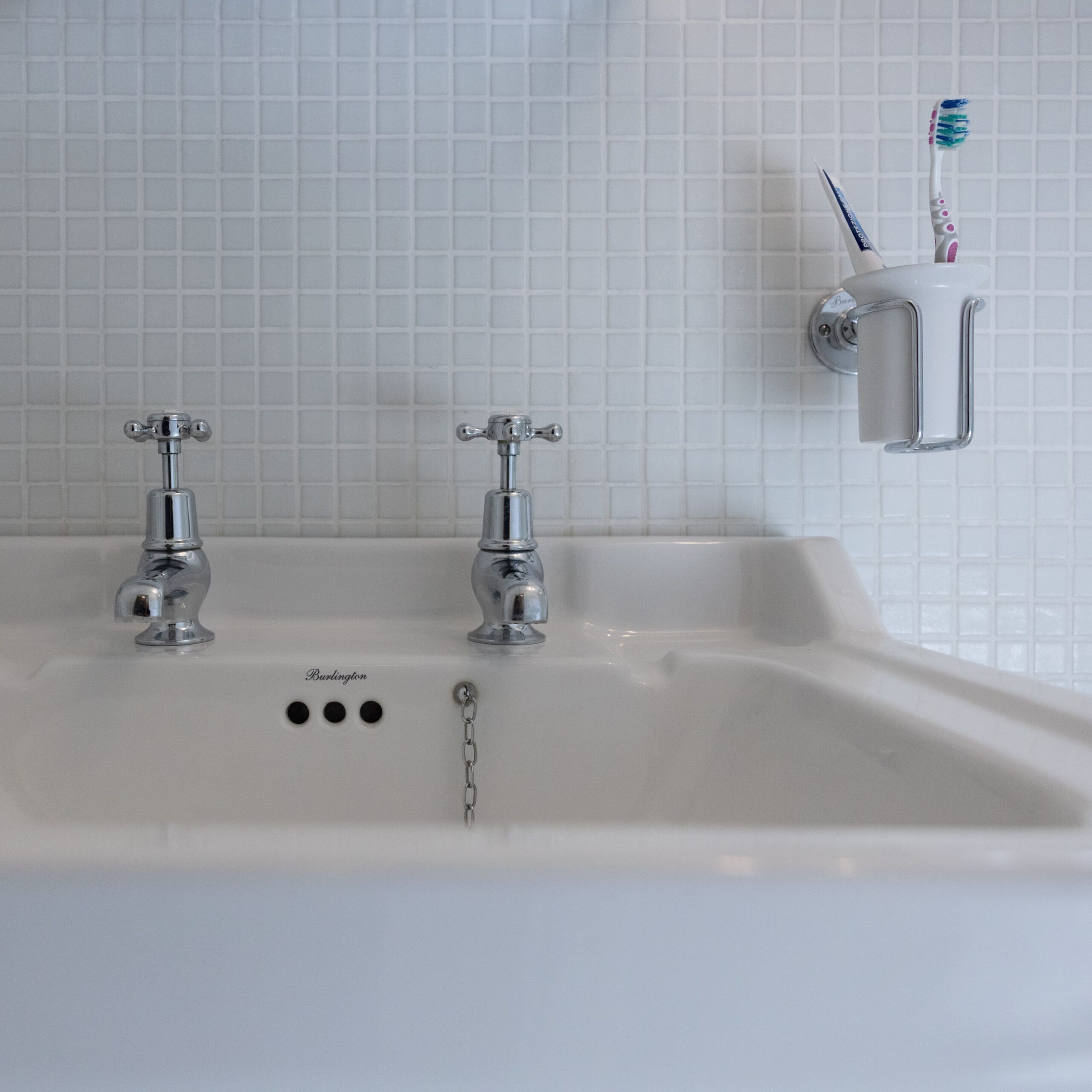 The bathroom followed a minimalist aesthetic, tiled entirely in white mosaic ceramics to give a clean and continuous finish. Period-style brassware, a walk-in glass shower, and flush detailing elevate the functionality while keeping the palette light and fresh.