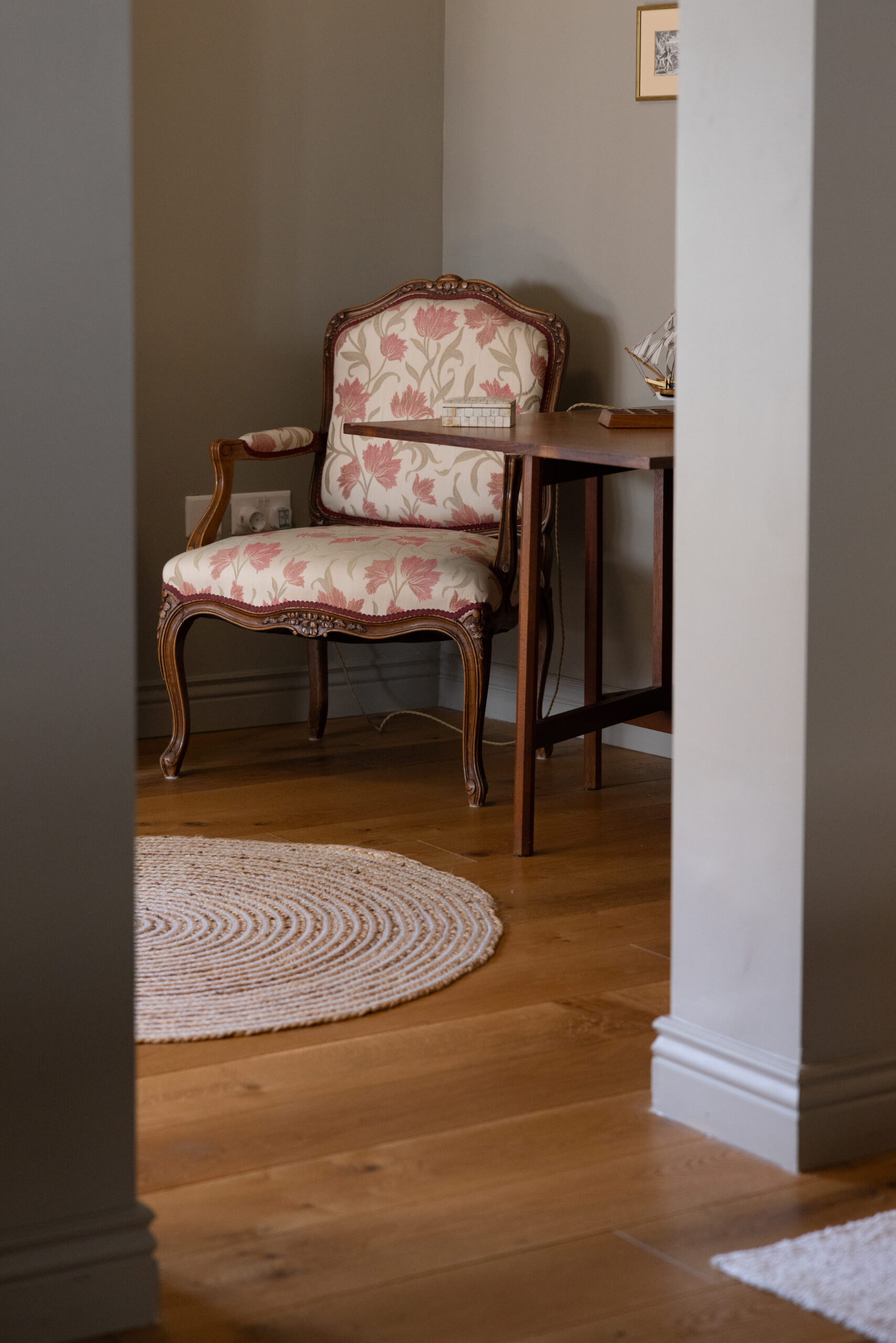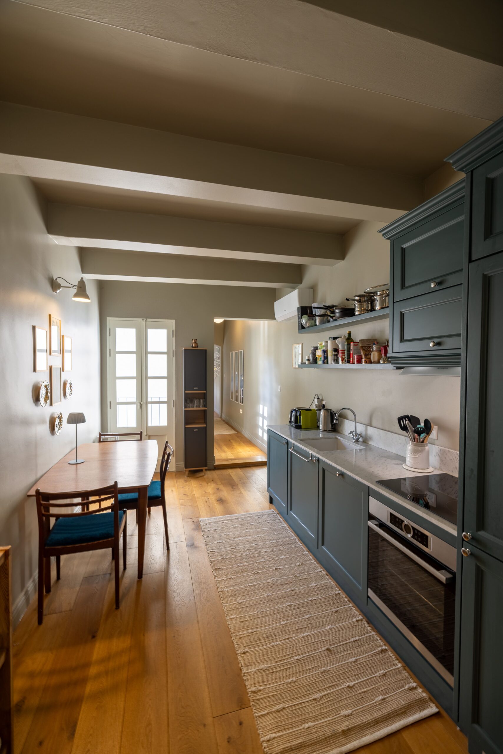 Living and dining areas were kept intentionally intimate. Warm greys on the walls soften the natural light, and classic furniture — from linen armchairs to mid-century wood — adds texture and warmth. Thoughtful choices like roman blinds, wall lamps, and detailed cornices give each room its own identity without losing harmony.