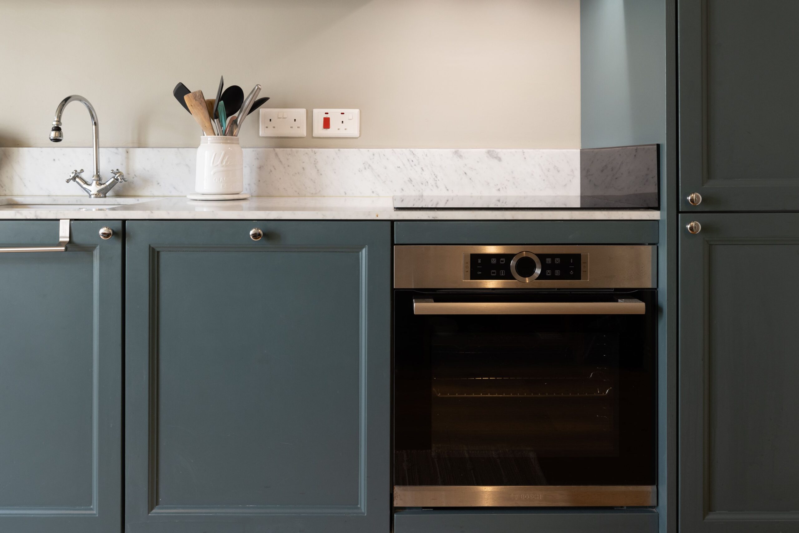 In the kitchen, we opted for solid-frame cabinetry in a rich desaturated blue, paired with a classic marble worktop and modern integrated appliances. Brass handles, open shelves, and subtle LED lighting complete the look — practical, but never sterile.